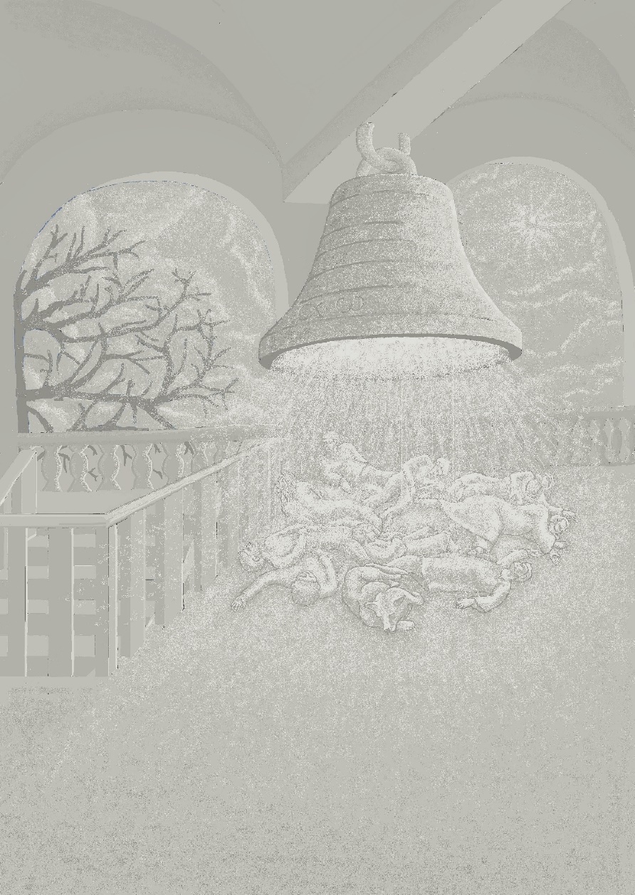 Тут же он ударил молоточком по колоколу. В колоколе появился туман, из которого мерцал свет. Но такое явление никого не смутило, все как один протянули руки. Затем их тела рухнули на пол, и рядом свалился пес Гербер. Собака инстинктивно прыгнула за куском резины, когда Виталиус поднял с ней руку. Все оказались внутри сферы и сразу голограммировались. Четверка скотоводов находилась в панике. Атас кричал, размахивая руками: