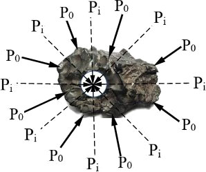 Гидродинамическое давление P0 (сплошная линия) прикладывается на её поверхностный слой, а гидродинамическое давление Pi (штриховая линия) прикладывается на все её внутренние точки тела. Разность ΔP = (P0 – Pi) является ответным давлением материального тела на эфир по 2-му закону Ньютона. Разность ΔP – это внутреннее сопротивление материального тела эфиру. Если конструкция тела позволяет выдержать эту нагрузку, то тело существует, в противном случае тело рассыплется. Этим можно объяснить взрывы звёзд. Пока звезда «рыхлая», P0 ≈ Pi, сопротивление звезды эфиру мало (ΔP ≈ 0). При сжатии звезды внутреннее давление эфира Pi начинает уменьшаться, так как возрастает плотность материальной массы звезды. Так как внешнее давление P0 остаётся постоянным, сопротивление звезды ΔP эфиру начинает возрастать до тех пор, пока выдерживает конструкция звезды. Как только внутреннее сопротивление ΔP достигнет предела прочности звезды, звезда со взрывом рассыплется.