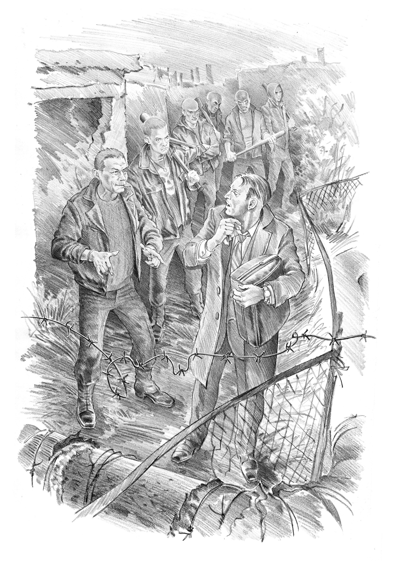 В этот момент где-то совсем рядом раздался оглушительный рев гудка, невидимый тепловоз загрохотал по рельсам по другую сторону забора. Земля задрожала, и мусорный остров заходил под ногами ходуном. Все шестеро, словно по заранее условленному сигналу, стали медленно надвигаться на перепуганного мужчину…