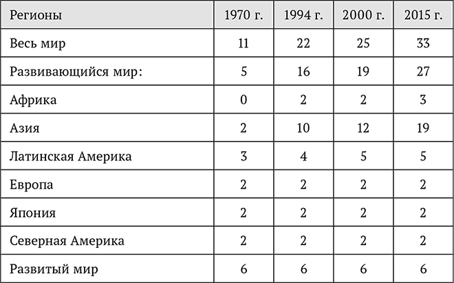 Таблица 2. Число мегагородов с населением свыше 8 млн человек, 1970–2015 гг.