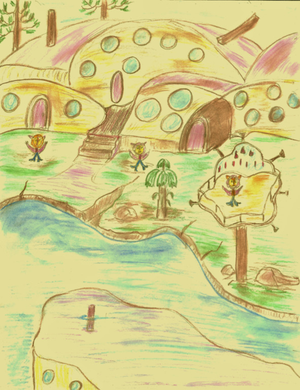 На берегу волшебного озера Тэр, в многоходовых пещерах и лабиринтах, жили добрые, работящие существа, которые могли жить как на суше, так и в воде. На дне озера у них был тоже построен город, предназначенный для отдыха, проведения праздников, спортивных и других игр. Рядом с этим городом находилось место для долгого сна. Сюда приплывали очень старенькие и больные тэры, ложились в специальные кровати и засыпали, чтобы через некоторое время проснуться молодыми и здоровыми. Подводный город служил также хорошим укрытием от страшных существ – чёрных птиц грофов, которые жили на противоположном берегу озера, в гнёздах на верхушках высоких сосен.