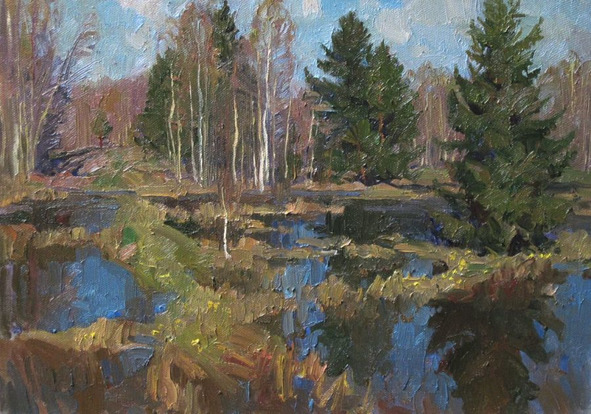 Весной всегда приятно добираться на работу по большой воде. Ещё едва рассвело, безветрие и неподвижность царят кругом, но даже в этом безветрии удивительно далеко разносится запах цветущей ивы, и отражения деревьев в воде кажутся нежно-зелеными, чем-то похожими на уснувшие облака.
