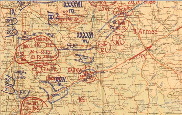 13 июля начались ожесточенные атаки русских. С направления Гомель на правый фланг танковой группы наступало около 20 дивизий, в то же время русские производили вылазки со своих предмостных укреплений из Могилёва в южном и юго-восточном направлении и из Орши в южном направлении. Этими операциями руководил маршал Тимошенко с явной целью отбросить немецкие войска снова за Днепр».