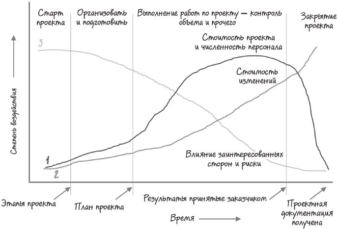 • влияние заинтересованных сторон, неопределенность проекта, возможность рисков (кривая 2);