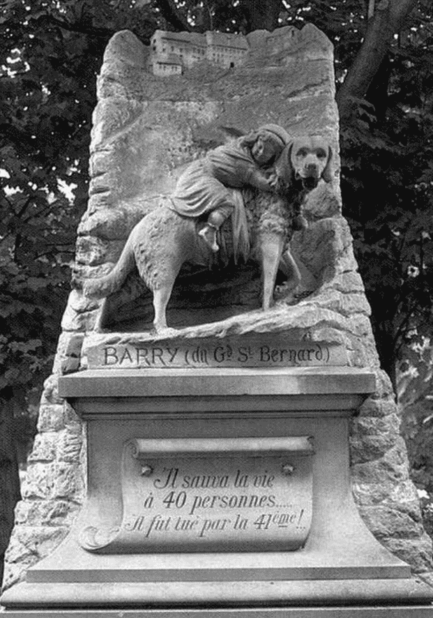 Начало монументальной собакиане положил памятник сенбернару Барри, открытый в Париже в 1899 году. Судьба и сенбернара Барри, и памятника хорошо известны. Эта порода была выведена в горных районах Центральной Европы лет 700 тому назад, а название свое получила от монастыря Святого Бернара, монахи которого много сделали для ее выведения. Собаки этой породы, одной из самых крупных в мире, широко использовались для розыска в горах людей, застигнутых зимней непогодой, засыпанных снегом. Снаряженная для поисков собака несла на себе продукты, одеяло, флягу со спиртным. Кроме того, она отогревала попавшего в беду человека теплом своего тела, и если он сам не мог идти, собака возвращалась к пославшим ее людям и приводила их на место происшествия. Сенбернара-спасателя по имени Барри знали многие альпийские жители Франции, Италии и Швейцарии. К концу его благородной и бескорыстной деятельности за ним числилось сорок спасенных человеческих жизней. Его попытки спасти сорок первую окончились трагически. Отогретый им человек принял его за волка и тяжело ранил – по одной версии ножом, по другой – выстрелом из револьвера. Швейцарским ветеринарам удалось спасти сенбернара, но продолжать свою спасательную службу он уже не смог. Чучело его до сих пор стоит в музее естествознания в городе Берне. А на парижском памятнике Барри изображен со спасенной им девочкой, сидящей у него на спине. На постаменте высечены слова: «Он спас сорок человек и был убит сорок первым».