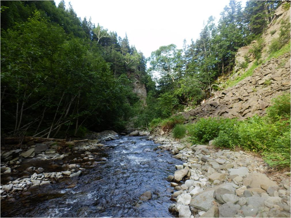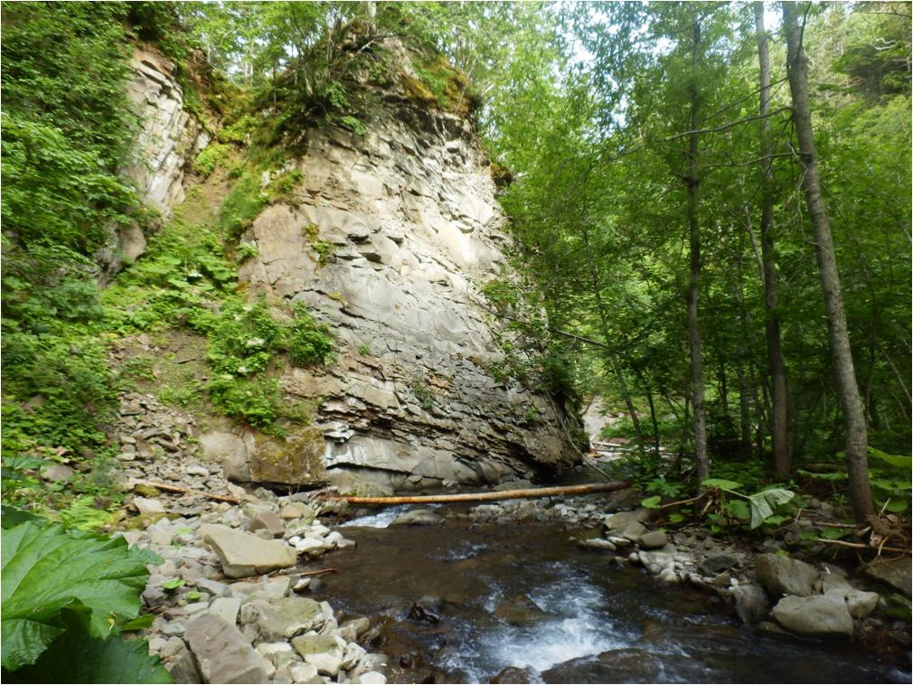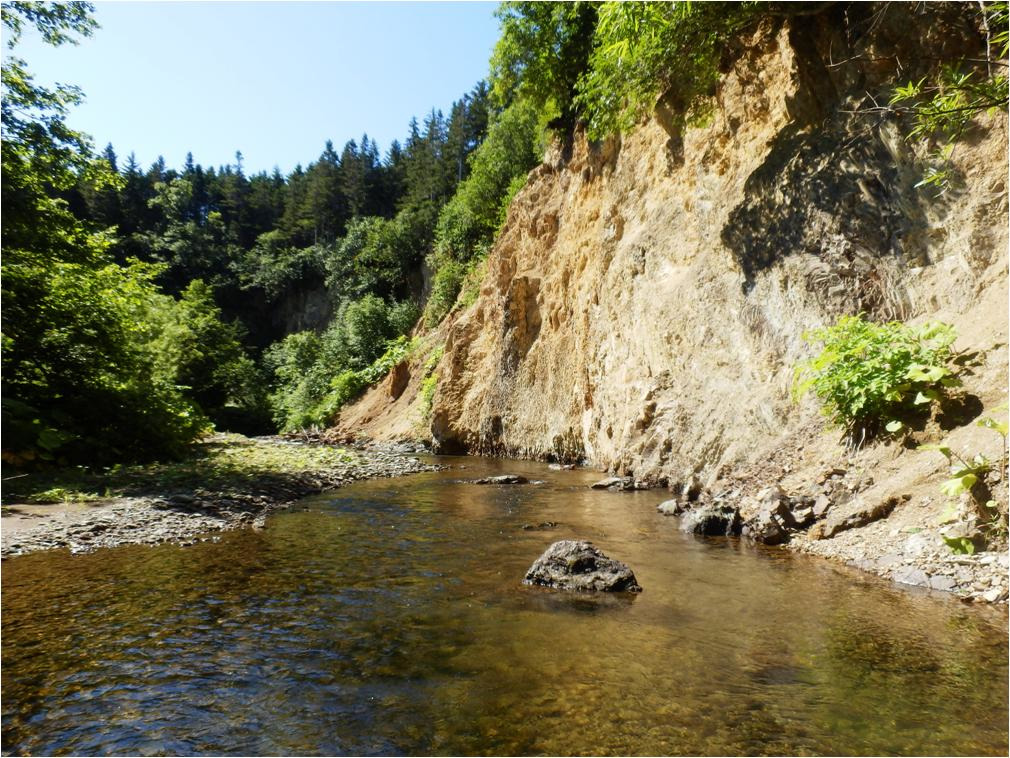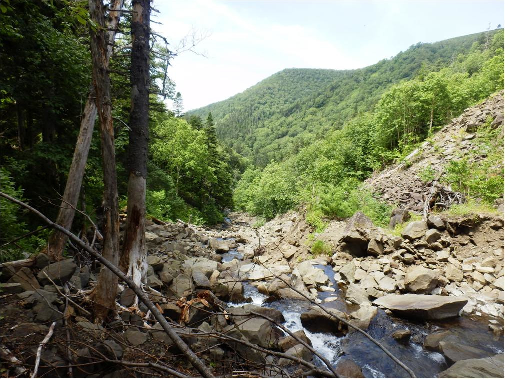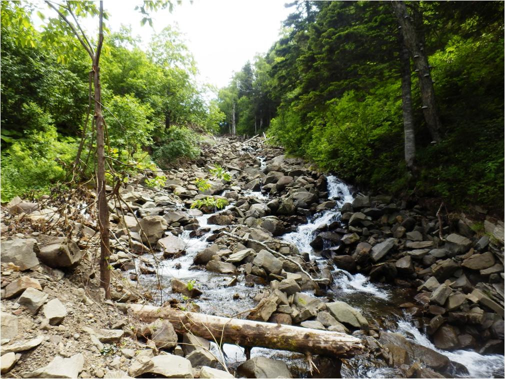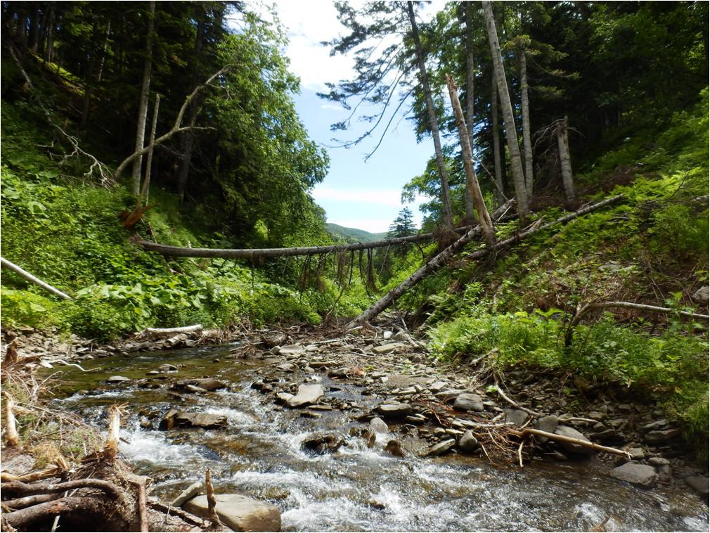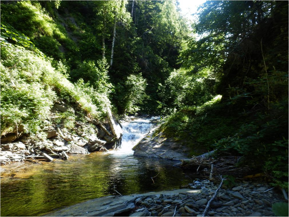 Помыл посуду, собрался, в семь тридцать вздрогнул. Как комары активизировались, так и вздрогнул. Снова пойма, завал на завале. Наконец река сменила характер. Побежала бодрей, пошагал по горной речке, в основном по воде. Поймы узкие, На склонах распадка ельник.
