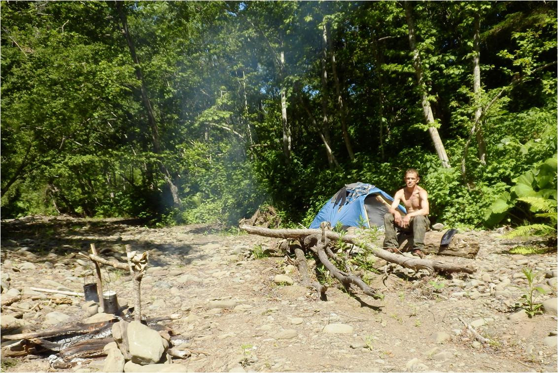 Завел огонь, рогачки установил с помощью булыжников. Половина клиньев на палатке, тоже держится за счёт булыжников. Грунт камень. Сапоги, носки, сохнут на солнышке, сам по пояс раздетый. Вокруг вьётся рой мелкой мухи.