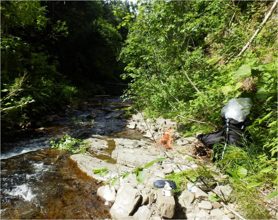 На берегу, прямо на породе, завёл костерок, чая попил, четыре часа пути позади.
