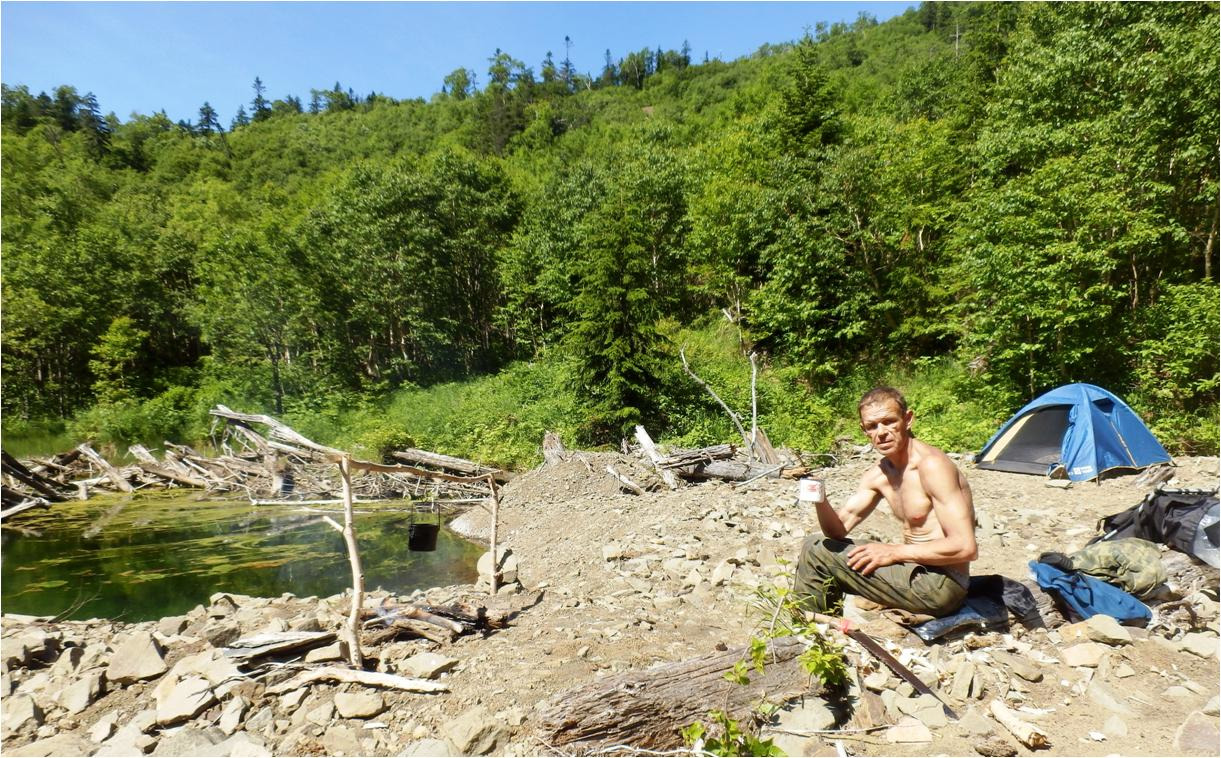 На восточной стороне более менее подходящее место под бивуак. Наносника полно. Нет ровного пяточка под палатку. Попробовал грунт ногой. О, место по палатку будет, было бы здоровье! Первым делом куском корневища, как скребком выровнял пятак под палатку. Разделся по пояс, жарко, однако. Комары изредка грызут, слепни, да оводы больше достают. В рубашке, невозможно работать, жарко. Небо полностью очистилось, дождя не предвидится.