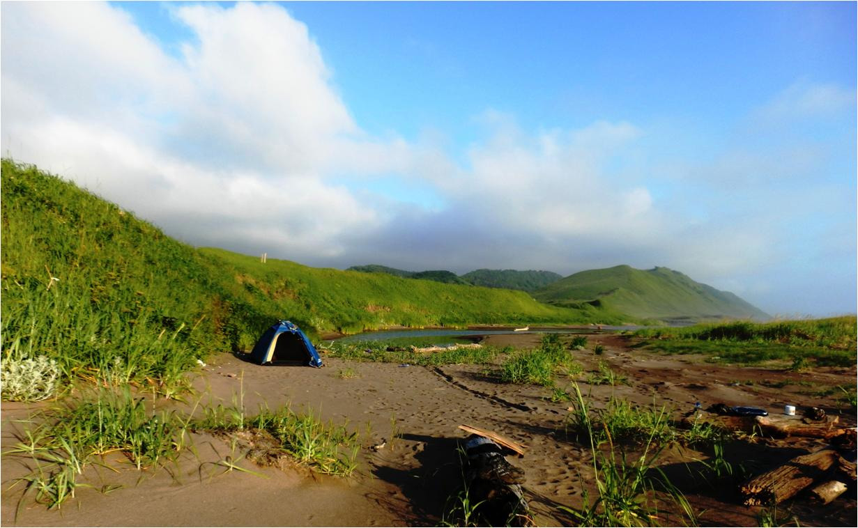 Проснулся в пять утра. Через полчаса поднялся, вылез с палатки. Роса обильная, но по небу уже гонит тучи. Нечего удивительного, так оно и должно быть, если сегодня растащит тучи, то это произойдёт ближе к обеду или за полдень. Обычная Сахалинская погода. Ветер тот же, юго-западный, умеренный. Гораздо тише, чем вчера.