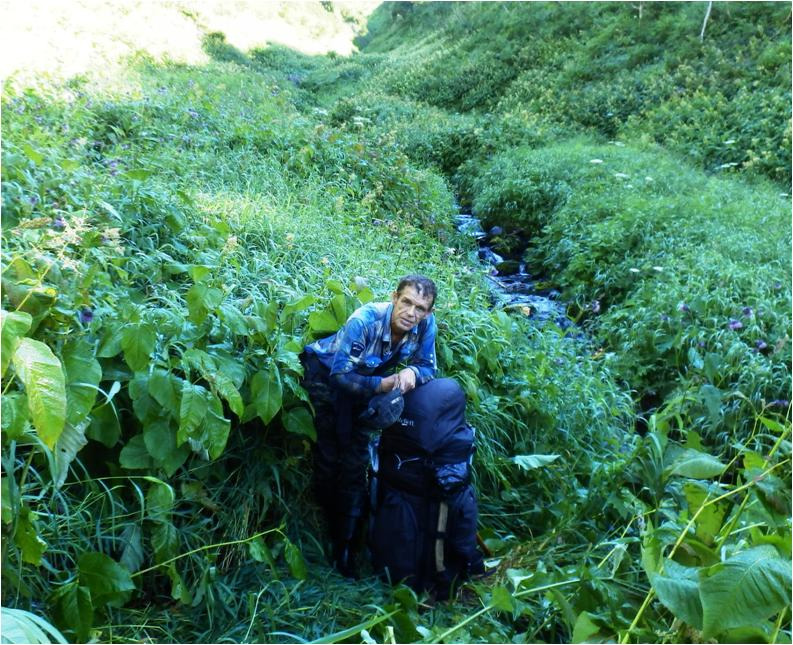 Аккуратно, осторожно спустился до воды, до притока речки Скалистой. Ручей приличный. Снежника нет, трава осока по грудь. По такому пути пятьдесят метров и мокрый до нитки. Перекур. Отрог махнул за сорок минут, нормально. Налегке, по снежнику, махал за двадцать минут. Дальше придется идти по воде в раскатанных сапогах. Нужно было сапоги сразу раскатать. На площадки, где цистерна вкопана. Колени уже мокрые от росы.
