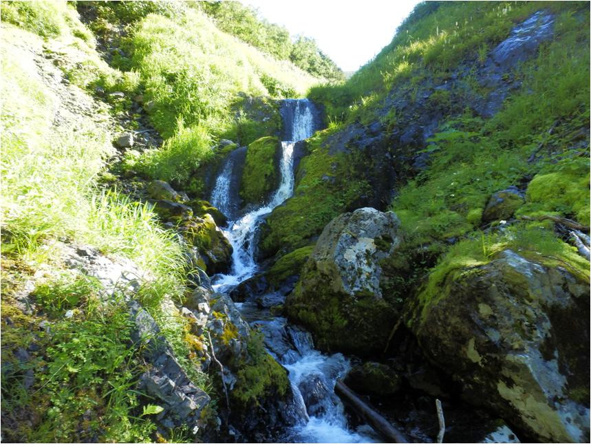 Снова бежит ручей, точней летит вниз ручей. Не повезло Тимохи. Люди в начале сентября фотографировали снежные гроты, пещеры высотой по четыре метра. Значит, в эту зиму и на севере острова было мало снега. На юге зима была малоснежной и вообще прошедшая зима была мягкой. Ни сильных морозов, не затяжных метелей хотя бы дня на три. Вот по этому и лета нет!