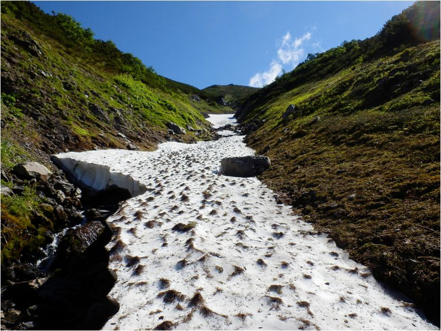Снежник сохранился, не доходя двести метров до гольцов, откуда медведей фотографировал. Узкая полоса снежника, снег, что железобетон.
