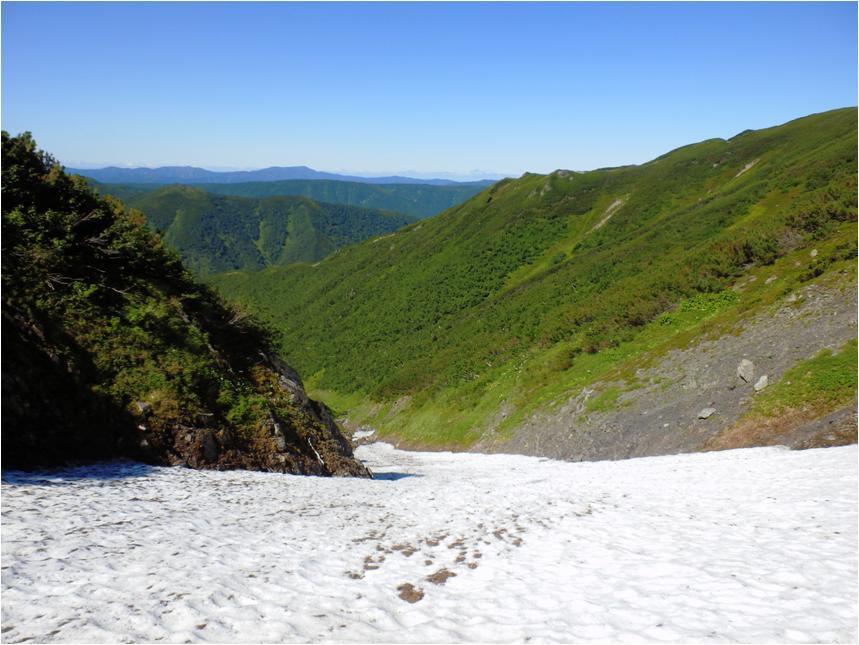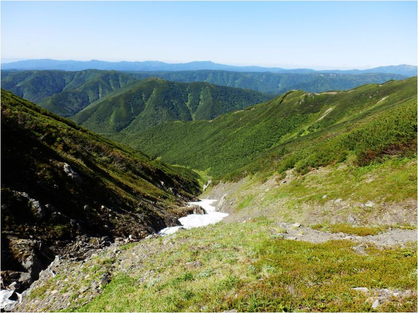 Тихонько, не напрягаясь, не газуя, взял крутой подъём, сначала по траве, потом сквозь черничник, и редкий стланик. Без остановок пошёл вниз. Спуск, ещё круче подъёма. Груженому очень тяжело проходить крутые спуски. К тому же путь плохо виден, трава мешает обзору под ногами. Геннадий сзади идет, ему-то что, он налегке. Хотя данный подъём и по снежнику тяжеловато брался даже налегке.