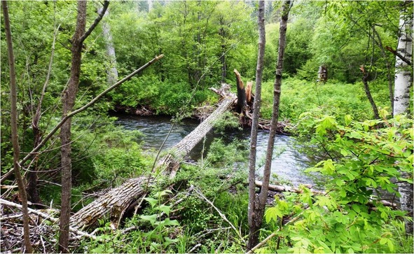 Пошёл по дороге заросшей молодым ивняком. По дороге бежит ручей, ну а недели две тому назад бежала река и такого натворила здесь. Камни, выворотни, завалы, глубокие ямы. Фактически дороги нет, остался тяжёлый путь. Пересек большую пойму, ушел на правый берег.