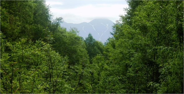 Здесь ещё хуже. Зеленка выше роста. Поднялся в ельник, валежина на валежине, местами частый еловый подрост, внизу мох сантиметров в пятнадцать. Снова ушёл в пойму. Видно гору Громова. Красиво и грозно смотрится гора Громова. Снежники придают особый колорит. Это хорошо когда на подступах к горам есть снежники.
