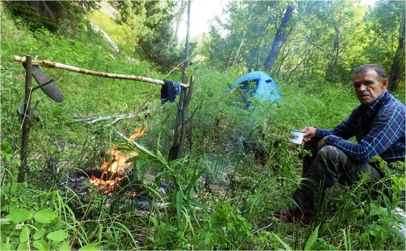 Прошёл хороший дождь, почему турист костер не заводит? Ну, делать ему больше нечего, как по ночам костры разводить. На медведей он плюет, но пока что не попал не в одного. А как только попадет, тогда всё, конец фоторассказам!