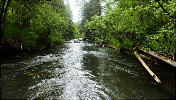Выше устья ручья, река Громова не переходима, валуны огромные, пороги, течение сильней, русло уже, летит большая горная речка. Уже не бурчит, не гудит, а грохочет. Комары усиливают натиск, они сегодня с утра начали. Небо затянуто. Форсировал реку, пошёл по ручью. Ручей большой, а вот распадок не глубокий, широкая пойма.