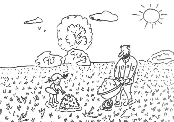 Дед нагружает тележку сеном, Катя собирает сено в маленькое ведро:
