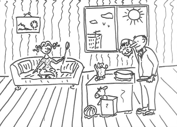 После «распаковки» нужных вещей, на детском столике оказались горка пластмассовых продуктов, холодильник, кастрюли, сковородки, ножи, вилки, чайник, чашки, посуда. Дед Петро обращается к внучке: