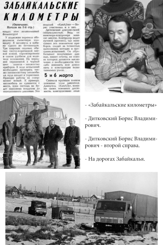 Борис принимал участие в испытании нового автомобиля, начиная с первой серии. Сейчас экзаменуется уже четвертая серия. За это время поработал и на бортовых, и на седельных тягачах, и на самосвалах. В 1973 году проводились государственные испытания основных моделей «КамАЗов» – Борис участвовал и в них.