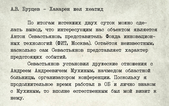 «… по итогам истекших двух суток можно сделать вывод, что интересующим нас объектом является Антон Севастьянов, представитель Фонда инновационных технологий (ФИТ, Москва). Остаётся неизвестным, насколько сам Севастьянов представляет характер предстоящих событий.