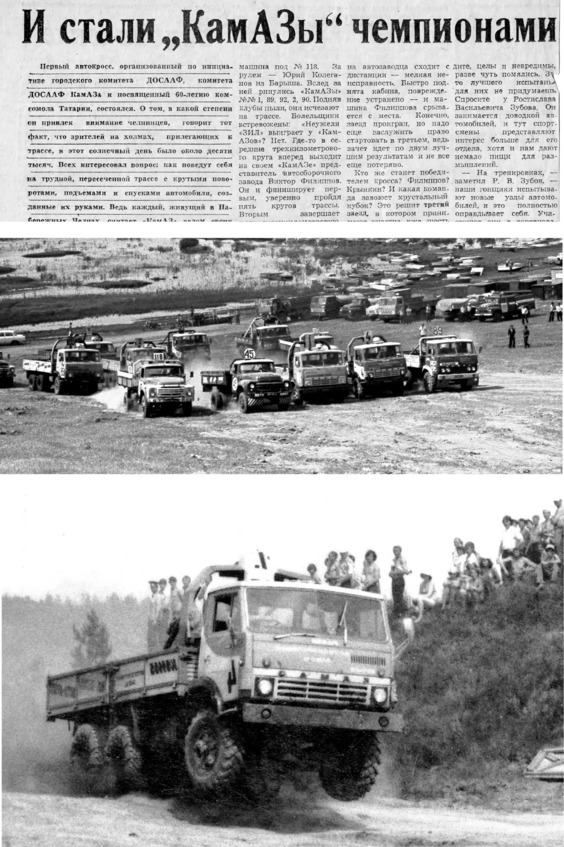 8 июля 1979 года в Набережных Челнах впервые состоялся автокросс грузовых автомобилей. Автокросс был посвящен 60-летию комсомольской организации Татарии. Организаторами выступили комитет ДОСААФ города Набережные Челны и комитет ДОСААФ КАМАЗа. В автокроссе приняли участие спортсмены автосборочного завода, управления главного конструктора КАМАЗа, а также гонщики автотранспортного предприятия из города Барыш Ульяновской области и спортивного клуба армии города Куйбышева14.