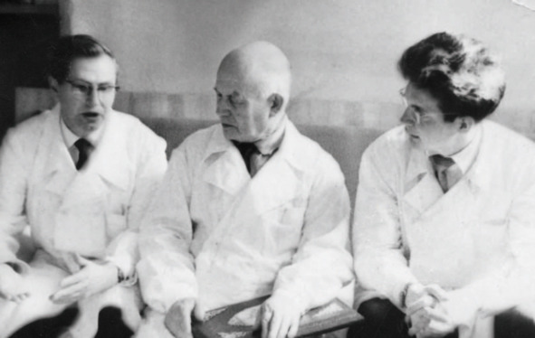 После учёного совета в ГИДУВе. Доцент Л. М. Нечунаев, профессор Р. А. Зулкарнеев, заведующий хирургическим отделением В. Г. Чуприн, профессор Е. М. Шульман, профессор И. А. Латфуллин