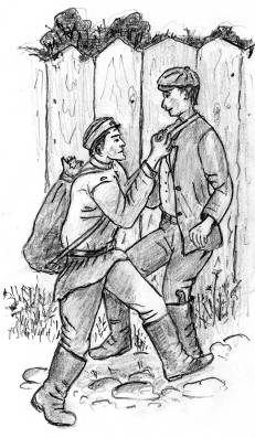 Александр неожиданно вырос перед ним и, схватив рукой за ворот рубахи толкнул и, прижав к забору, злобно тихо сказал: