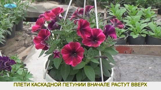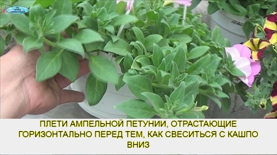 На ампельных петуниях побеги растут вначале горизонтально и по мере подрастания начинают плавно свешиваться вниз:
