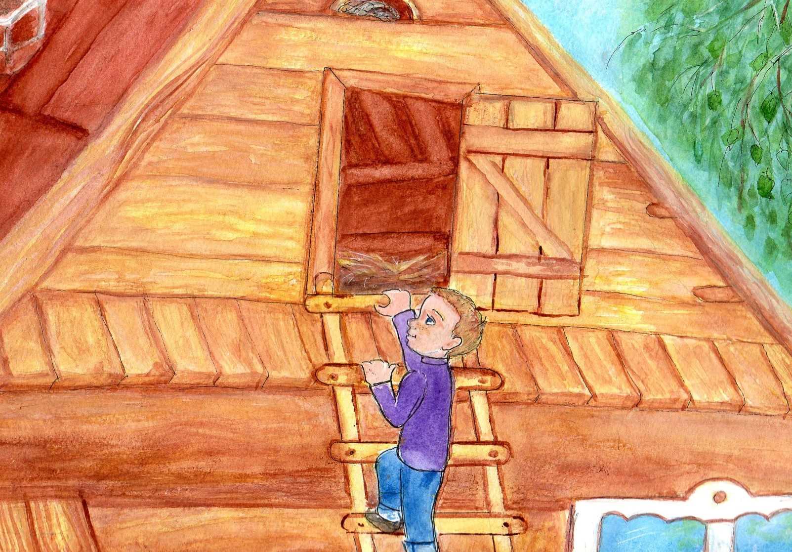 Он быстренько вскочил на кромку гнезда, посмотрел сверху вниз во двор и… испугался. Тогда он перепрыгнул на балку и начал бочком по ней перешагивать, оглядывая внутренности чердака. Однако и тут показалось слишком высоко, но надо было решаться. И он, крепко зажмурившись, немного подпрыгнул и быстро-быстро затрепетал крылышками.