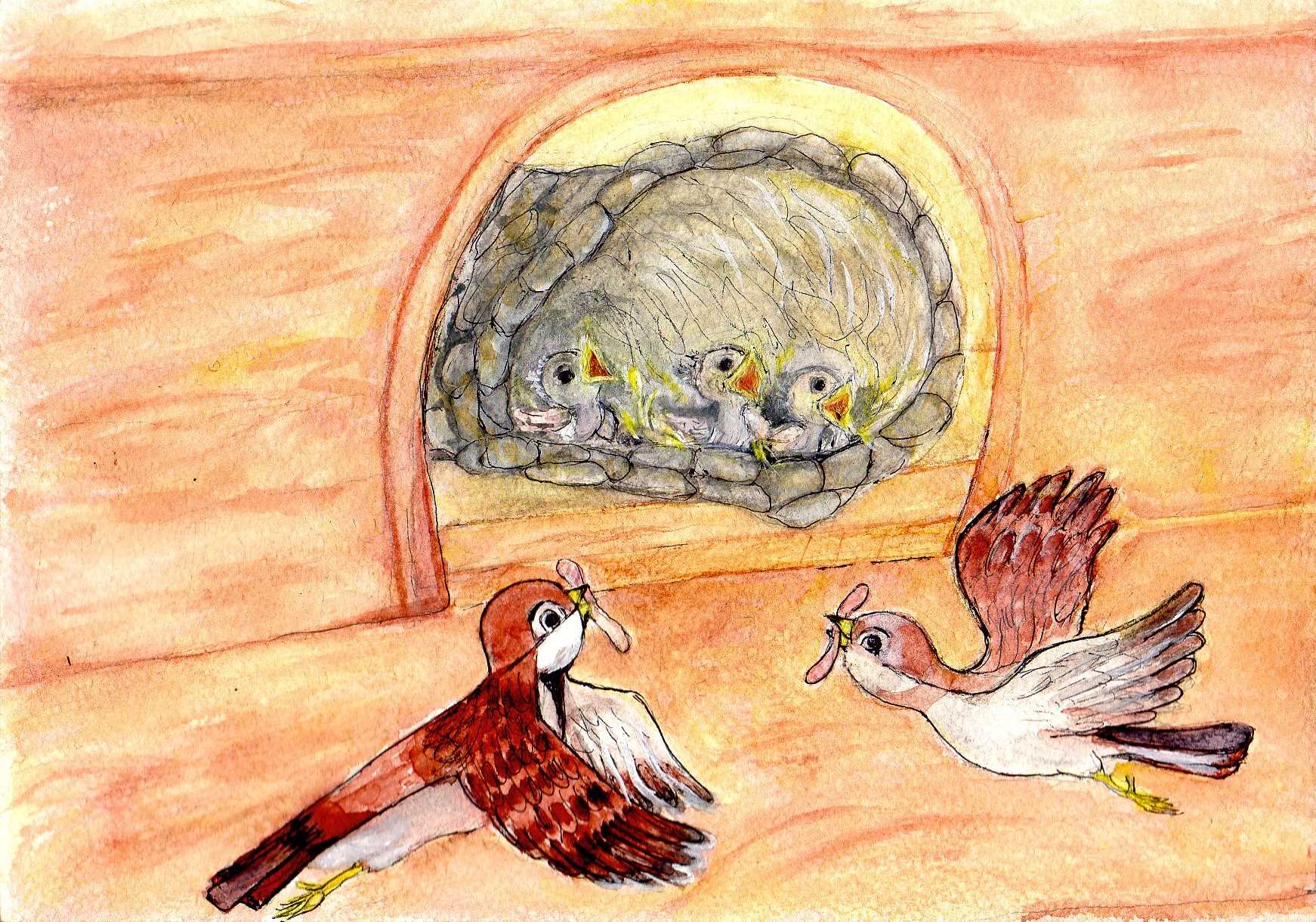 Хочу вам рассказать по поводу этого их жилища, что воробьи, вообще-то, сплошь да рядом селятся в брошенных ласточкиных гнездах, особенно когда те улетают на юг. Точно так же поступили в конце прошлой осени и наши молодые родители – папа Чиру и мама Чика.