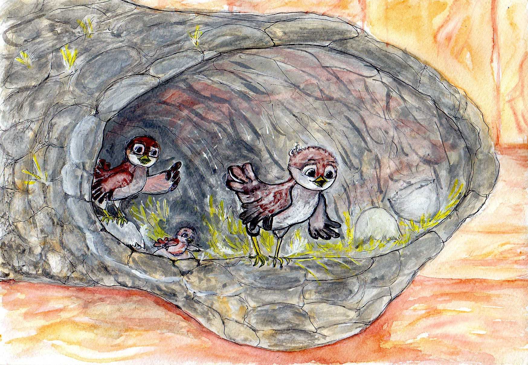 Первым из своего яичка вылупился воробьенок-мальчик. Надо сказать, что по воробьиным обычаям все имена должны обязательно начинаться на «Чив», «Чик», «Чир» «Чав», «Чак» или «Чар». Чтобы не возникало путаницы, птенцам давали имена, не похожие на родительские. Таким образом, если папино имя было Чиру, то есть на «Чир», а мамино Чика, то есть на «Чик», то всех своих деток они решили называть на «Чив». Своего первенца они назвали просто Чив, так как по тем же воробьиным обычаям короткое имя, состоящее всего из одного слога, считалось самым почетным и всегда присваивалось самому первому мальчику.