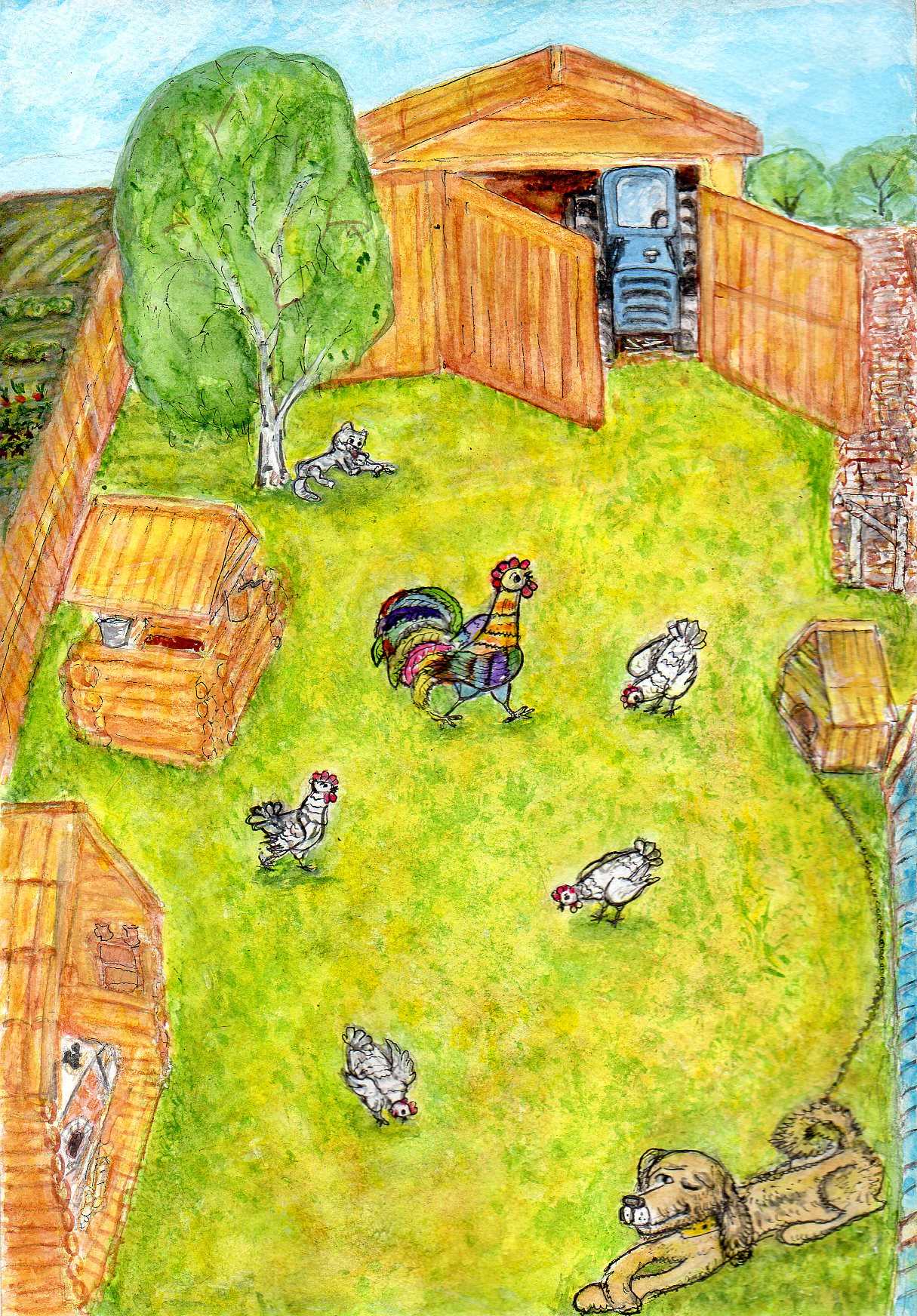 Посреди двора с важным видом расхаживал петух Захарка и вокруг него суетились курицы. Около конуры перед воротами на улицу вполглаза подремывал пес Лаврик. В тени березы, притулившейся в уголке между колодцем и сараем, кошка Зинка вылизывала котенка Мурзика. Из открытого сарая виднелась передняя половина трактора.