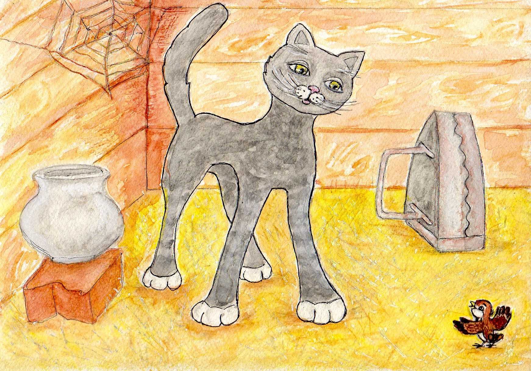 Повернув голову, наш незадачливый летун увидел подходящую к нему кошку Зинку. Если вы когда-то стояли рядом с живым слоном, то прекрасно поймете, каково это смотреть на такую громадину. Ну а Зинка показалась маленькому воробушку гораздо более крупным зверем, чем слон по сравнению с человеком.