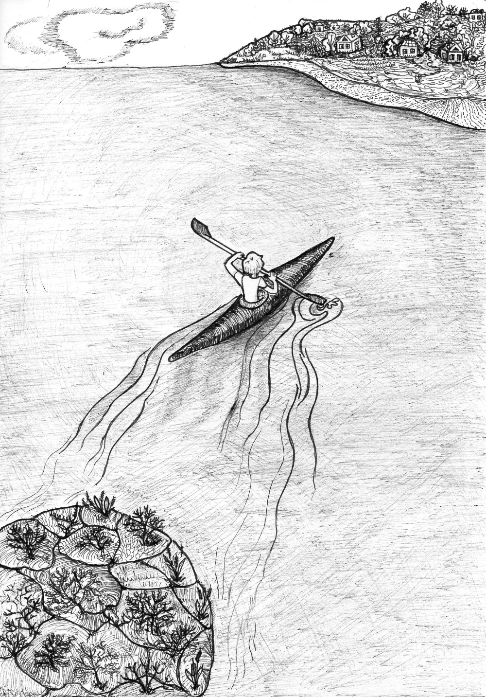 Позвав несколько раз и не дождавшись ответа, он решил самостоятельно спустить ее на воду. Байдарка оказалась настолько легкой, что тащить ее по песку не составило особого труда. Дальше он двинулся по пологому дну, слегка подталкивая ее по растревоженной водной поверхности и жмурясь от бесчисленных солнечных бликов. Когда вода дошла до колен, он забрался в отверстие для гребца, в результате чего ноги оказались протянутыми вперед, а верхняя часть туловища, голова и руки остались снаружи. На самом деле он видел такую лодку первый раз в жизни, но догадаться, что тут к чему, было несложно. Он начал неуклюже грести то левой, то правой стороной весла и сам удивился, насколько легко это проворное суденышко скользит по воде и делает повороты. После небольшой тренировки его движения стали намного уверенней, и он решился на небольшое водное путешествие.