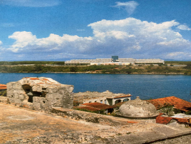 Да, и ещё надо заметить, что с прогулочных веранд на крыше этого огромного отеля открывались прекрасные виды на выход из залива в Карибское море слева, «дальний» и «ближние» наши пляжи с бетонными пешеходными дорожками на рифовых берегах. Наш городок Сьюидад Нуклеар тоже хорошо смотрелся со своими двумя недостроенными высотными зданиями и вечным краном у одной из них, «тарелкой» водонапорной башни, дальним незавершённым куполом первого блока строящейся АЭС и дорогой спускающейся к причалу, справа от которого возвышалась на холме старая испанская крепость Хагуа и далее вправо уходил залив в Сьенфуэгос.