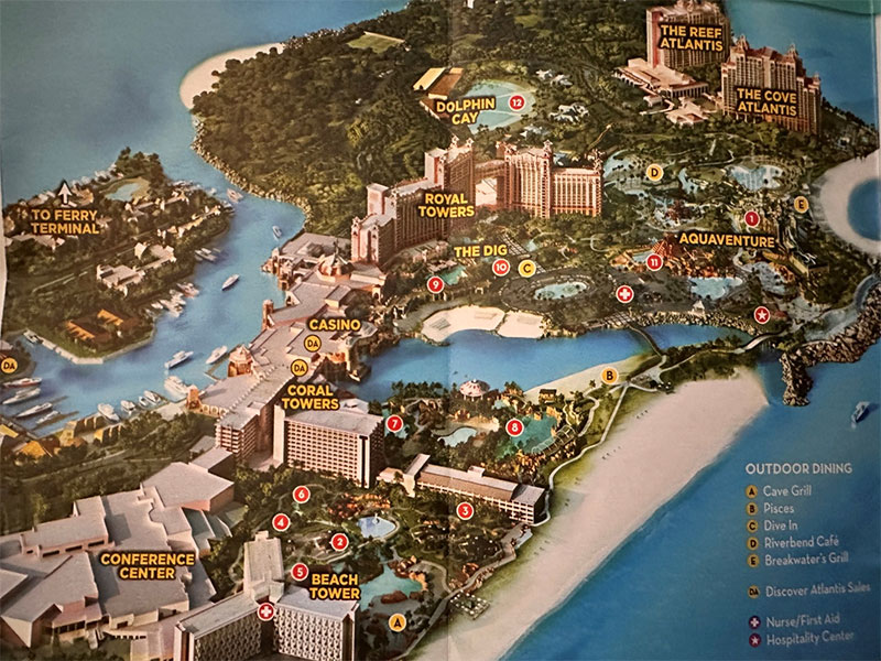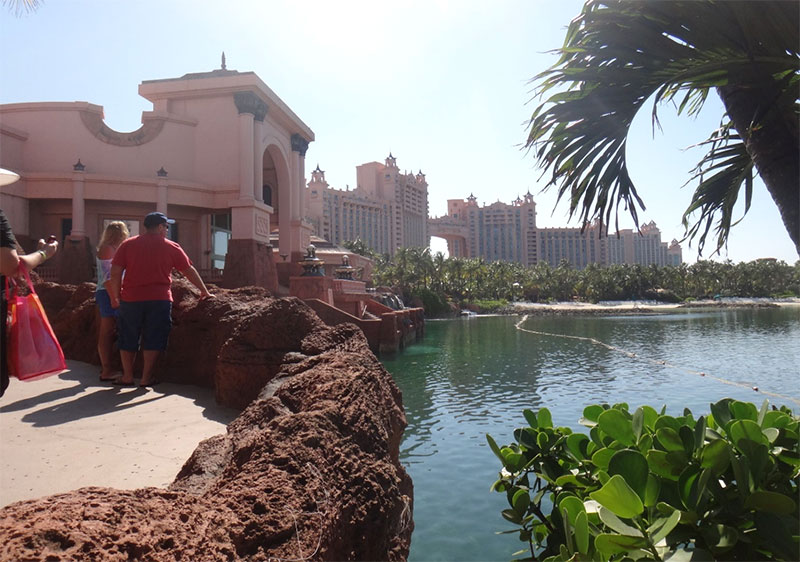 Синтия рассказывала, что они вчера с друзьями ездили на экскурсию в знаменитый отель Атлантис и играли в казино там долго, а сегодня они едут в Национальный парк с садом и зоопарком под названием «Ardastra», смотреть на розовых фламинго и прочих слонов. А я вот сегодня собрался в этот отель после завтрака на экскурсию, купив вчера тур за 50 баксов. Буду повышать свой культурный уровень и кругозор, главное, чтобы не выбиться из сил, как вчера. На автобусе всех желавших, посетить Атлантис туристов из нашего отеля, привезли к месту назначения, и надели белые браслеты на руку. Как они здесь, однако, любят везде браслеты надевать на туристов, не только в отелях, но и в разных заведениях! У меня ещё из пиратского музея на руке браслет висит, а если их все не снимать, то можно целую коллекцию собрать! Также выдали проспекты с описанием отеля и схемами маршрутов прогулок по нему, и запустили на территорию отеля бродить самим в свободном плавании до обеда.