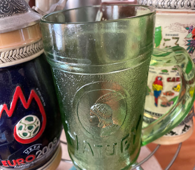 А у меня дома в большой коллекции пивных кружек со всего мира, среди красивых металлических, керамических, деревянных с крышками и без оных, немецких и всяких прочих других разных кружек хранятся две простые из стекла. Одна обычная советская пивная кружка из легендарного московского пивного бара «Ладья», что был в Столешниковом переулке, а вторая зеленоватого цвета с профилем мужественного вождя племени таино Атуэя, привезённая с Кубы.