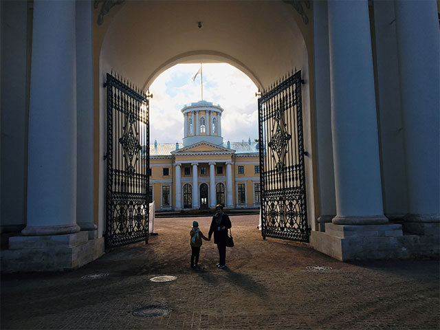 В сентябре 2019 года выбрав свободный день поехал в Архангельское не по старой и знакомой дороге-«рублевке», а по новой трассе, через эстакаду на МКАДе. Припарковав машину на стоянке возле ворот с надписью: «Военный санаторий-Архангельское» и купив входные билеты, пошел парковой дорогой к дворцу поглядывая на знакомый спальный корпус слева. Прошел к Императорской аллее, откуда раньше приезжали гости с московской дороги прямо ко дворцу, эта перспектива стала стержнем всего ансамбля, обсаженная соснами, березами и елями, она подводит вас к массивной въездной арке Парадного двора, в проеме которой виден портик Большого дома.