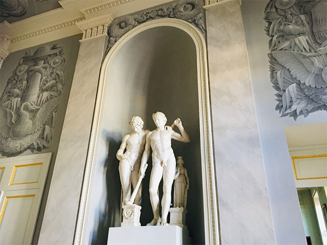 Войдя во дворец через задние двери со стороны флигелей, и предъявив входные билеты бдительным старушкам-билетершам, под их строгими взглядами надели тапки-бахилы на обувь. Проходим через застекленные двери в величественный Вестибюль, объединенный с парадным двором мотивом колоннады: высокие пилястры несут классический карниз, углы здания чуть закруглены, в полуциркульных каминных нишах – скульптурные группы «Амур и Психея» и «Кастор и Поллукс» (копии с античных оригиналов рубежа 18–19 вв.), стены украшает роспись в технике гризайль. Холодноватый, серебристо-серый колорит Вестибюля в сочетании с мрамором скульптур служат достойным вступлением в торжественную атмосферу парадных залов. Вестибюль, Аванзал и Овальный зал составляют центральную анфиладу Большого дома.