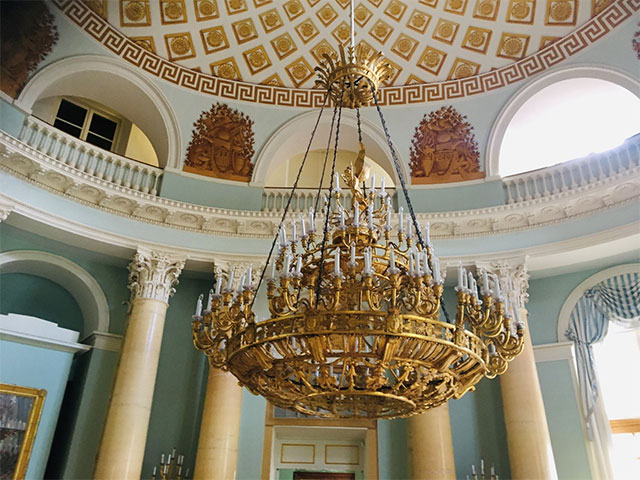 Двухсветный Овальный зал – архитектурный и композиционный центр дворца. Мощные колонны искусственного мрамора поддерживают идущие по периметру залы, хоры и подымающийся над ним высокий купол с полу циркульными арками. Свет, льющийся из застекленных дверей и окон за арками, теплый желтоватый тон колонн, золото с белым в росписи «кессонированного» купола, живописный плафон «Амур и Психея» Н. де Куртейля в его центре одухотворяют строгую архитектонику зала. Летом двери Овального зала распахивались в сад, объединяя пространство дворца и парка.