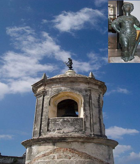 А вот над бастионом крепости Реаль-Фуэрса, расположенным с северо-запада возвышается круглая башня, построенная в 1631 году для дополнительной обороны крепости, с неё наверно защитники крепости поливали нападающих пиратов раскалённым маслом и кидали на них камни. В этой башне висит старый медный колокол, позеленевший от времени, он когда-то своим звоном предупреждал гаванцев о нападениях пиратов. Сверху эта башня украшена флюгером красивой формы, названным Хиралдилья в честь известной башни Хиральда в Севилье.