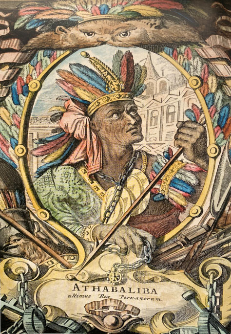 Портрет Атауальпы, последнего властителя инков, приговорённого к смерти испанским конкистадором Франсиско Писарро. Гравюра 1673 г.
