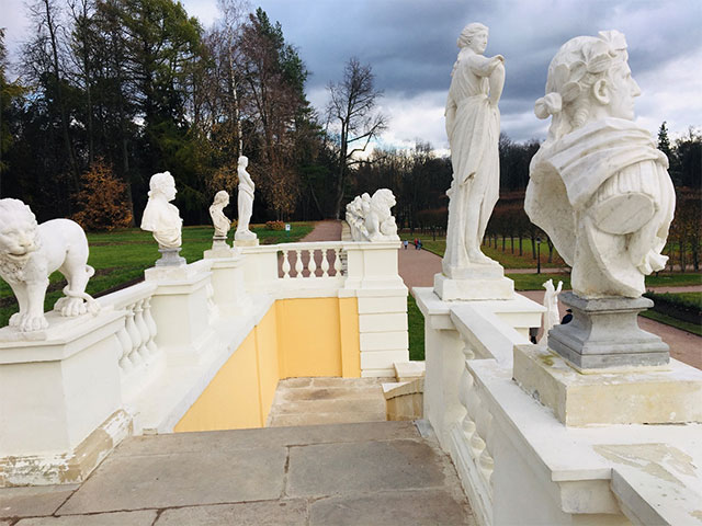 Выйдя после осмотра залов из дворца к террасам, наблюдаем перспективу Большого партера и спускаемся с Верхней террасы к Нижней. Эта лестница, ведущая со второй террасы к Большому партеру. По праву считается одним из лучших украшений парка в Архангельском. Ее марши расходятся в разные стороны, чтобы, дойдя до половины подпорной стены, повернуть навстречу друг другу и опуститься до земли. Скульптуры везде сопровождают человека, идущего по ступеням: бюсты Цезаря и Августа на парапете верхней площадки, соседствуют с мраморными львами, четыре аллегории Частей Света стоят на окаймляющем спуск широком барьере, парные «египетские» гермы словно охраняют вход в Грот со статуей Венеры Медицейской внутри.
