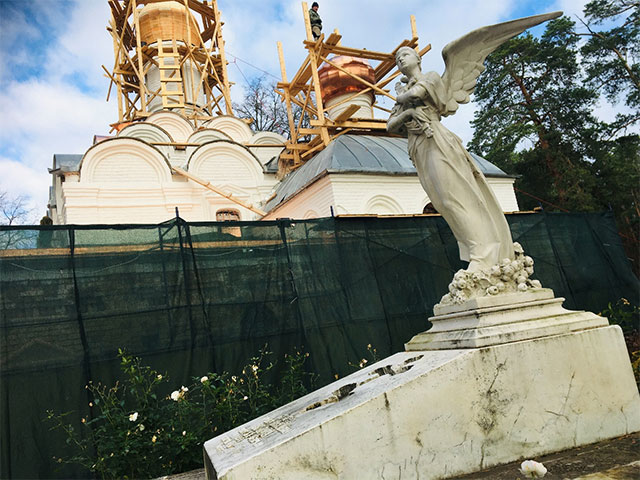 Зайдя на небольшую территорию вокруг храма, я увидел, что и он тоже закрыт строительной ограждающей сеткой, а на лесах рабочие покрывали листами яркой меди головки куполов. По узкой каменной дорожке можно было обойти вокруг храма и со стороны Москвы-реки, где находилась могила Татьяны Николаевны Юсуповой (14.02.1866–15.06.1888), родной сестры Зинаиды, умершей молодой, там я с удивлением обнаружил, что на могиле стоит новая копия надгробной статуи девушки-ангела работы Марка Антокольского, ранее в мои прошлые приезды сюда ее не было.