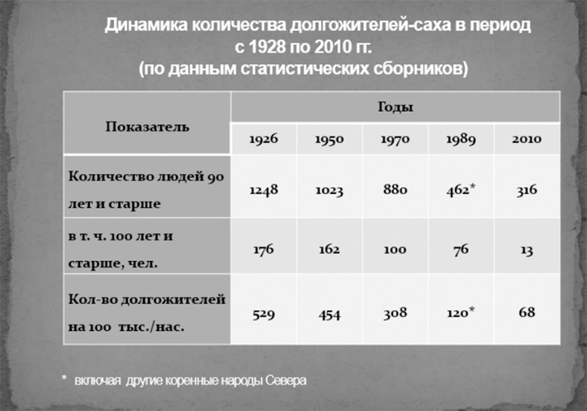 Регионального долголетия, о котором ранее можно было часто услышать, нет и в Якутии. По данным переписи 1959 года, на каждые 100 тыс. населения в ЯАССР было 32 человека старше 100 лет, а это третье место после Кавказских регионов по количеству долгожителей в Советском Союзе. По материалам переписей населения 1970, 1979 и 1989 года, также было много таких людей. Повышенное число столетних в республике было зарегистрировано и по итогам Всероссийской переписи населения 2002 года. А вот на 1 января 2018 года, по данным Федеральной службы статистики, там всего 32 человека старше 100 лет (24 женщины и 8 мужчин). Таким образом, при населении Якутии около 1 млн человек этот показатель составил 3 человека старше 100 лет на 100 000 населения, что в 10 раз меньше, чем 60 лет ранее. Но это не потому, что теперь меньше людей доживает до 100 лет, а просто из-за того, что учет возраста стал намного лучше. Недавно ученые из Якутского научного центра комплексных медицинских проблем и Северо-Восточного федерального университета им. М. К. Аммосова внимательно рассмотрели церковные и статистические документы Оймяконского и Сунтарского улусов, где так называемый феномен долголетия был наиболее выражен. Поименно сравнивался возраст конкретных жителей Оймяконского района из посемейного списка за 1928 год с перечнями, составленными в период с 1942 по 1946 годы. В результате было установлено, что в большинстве случаев в 1940-х годах люди предоставили завышенные данные о своем возрасте[18]. Вот и ответ о причинах якутского долголетия.