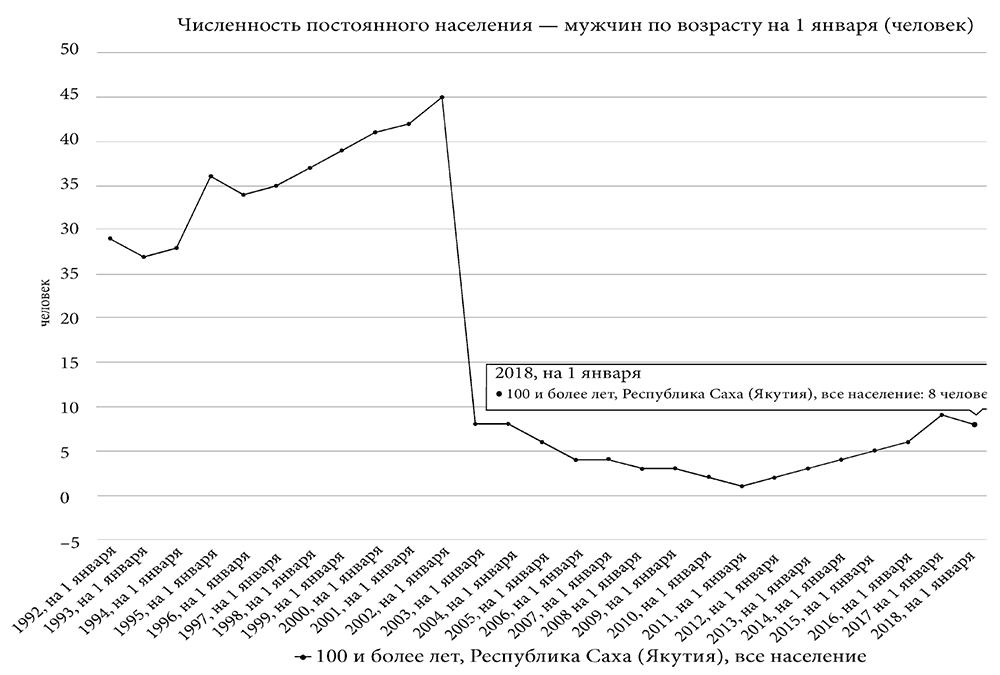 График динамики количества мужчин в возрасте 100 лет и старше в республике Саха, Якутия. (Данные Федеральной службы государственной статистики РФ)