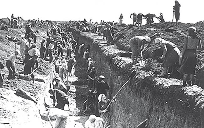 Ежедневно, по несколько раз в день, пролетали вражеские самолёты, которые обстреливали нас из пулемётов, с целью запугать, воздействовать на нервы. Но иногда их самолёты летели вдоль всей трассы рва, ведя огонь из пулемётов. При обстреле с фланга, нам укрыться во рву не удавалось и мы разбегались кто куда. А однажды на нашем участке сбросили авиабомбу, которая летела со страшным воем и свистом. Бомба упала на землю недалеко от нас, но взрыва не последовало. «Знатоки» определили, что она с взрывателем замедленного действия. Через час нашёлся смельчак, который подошел и обнаружил, что это не бомба, а бочка с отверстиями. При падении эти отверстия в бочке и издавали такой страшный вой. Но чаще всего немцы сбрасывали с самолётов листовки с призывами прекратить сопротивление и сдаваться в плен. Обещали сохранить жизнь, обеспечить хорошие условия и сообщали, что к ним в плен уже сдались многие сотни тысяч красноармейцев и командиров. В одной из листовок, с фотографией, немцы сообщали, что им, добровольно сдался в плен старший сын Сталина, якобы полковник, командир танковой части.[1]