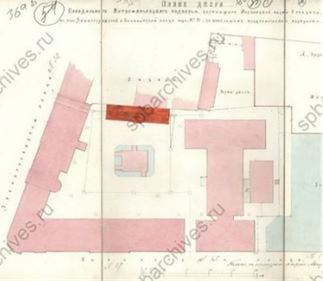ЦГИА СПб. Ф. 513. Оп. 102. Д. 4796. Чертежи здания на участке, принадлежавшем Петербургскому университету, синодальному Митрофаньевскому подворью по Звенигородской ул., 12 и Кабинетской ул., 13, 15, 17.